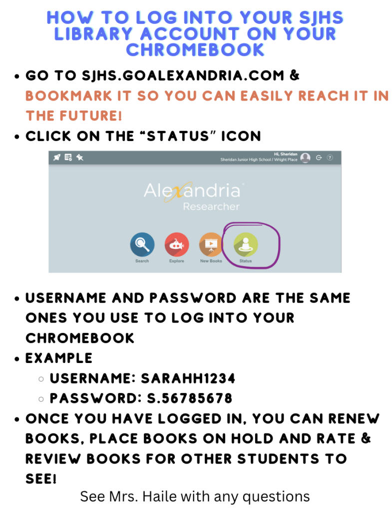 If you have any questions, please contact Sarah Haile, Librarian at SJHS, at sarah.haile@scsd2.com